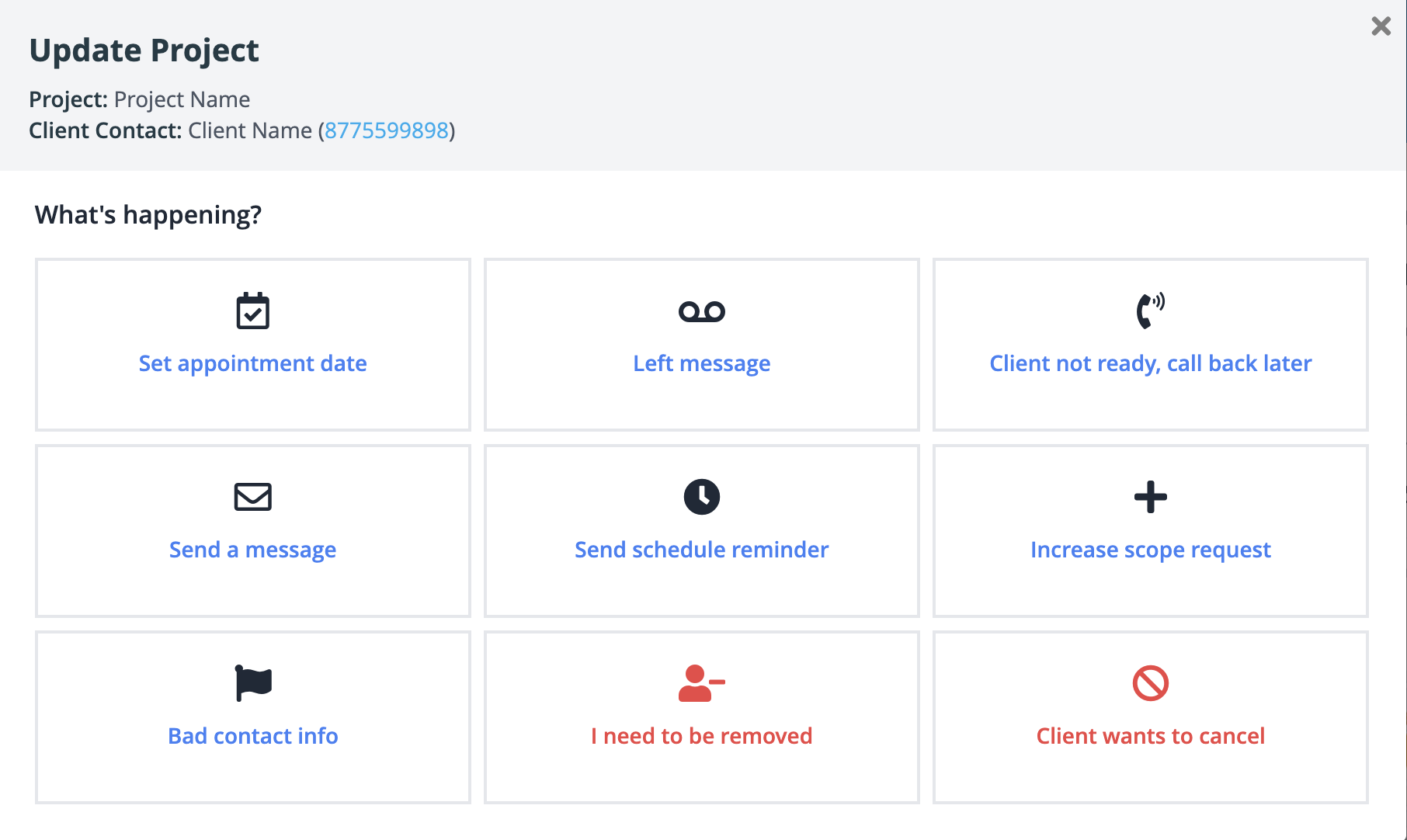 Left message and Client not ready, Call back later: Use these to leave notes about ANY scheduling attempts and set a Follow-up number of days. This will properly update your projects on your Tasks-Due page and prevent projects from being "late."